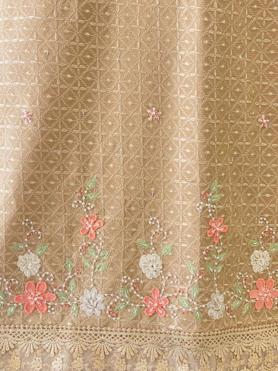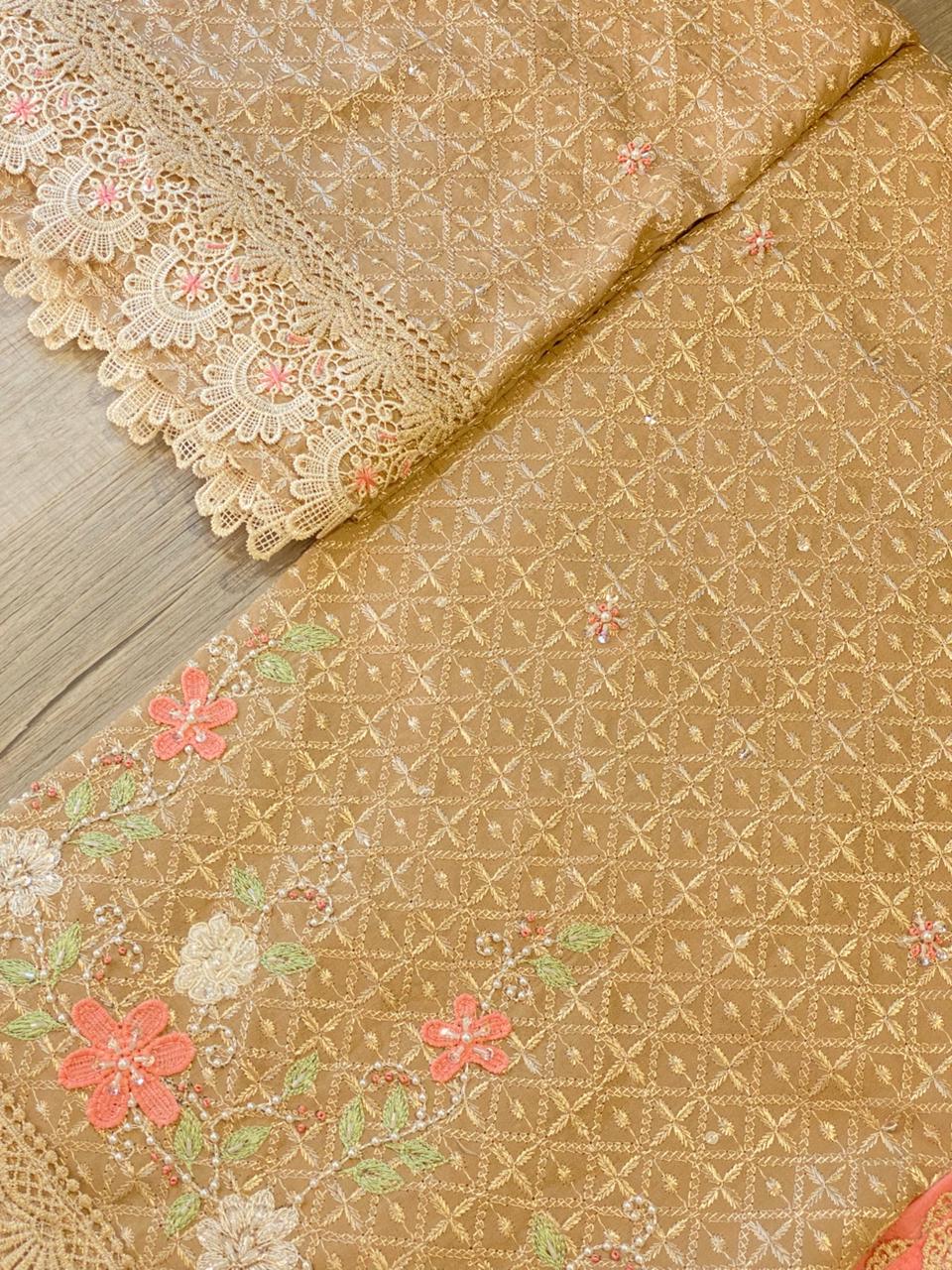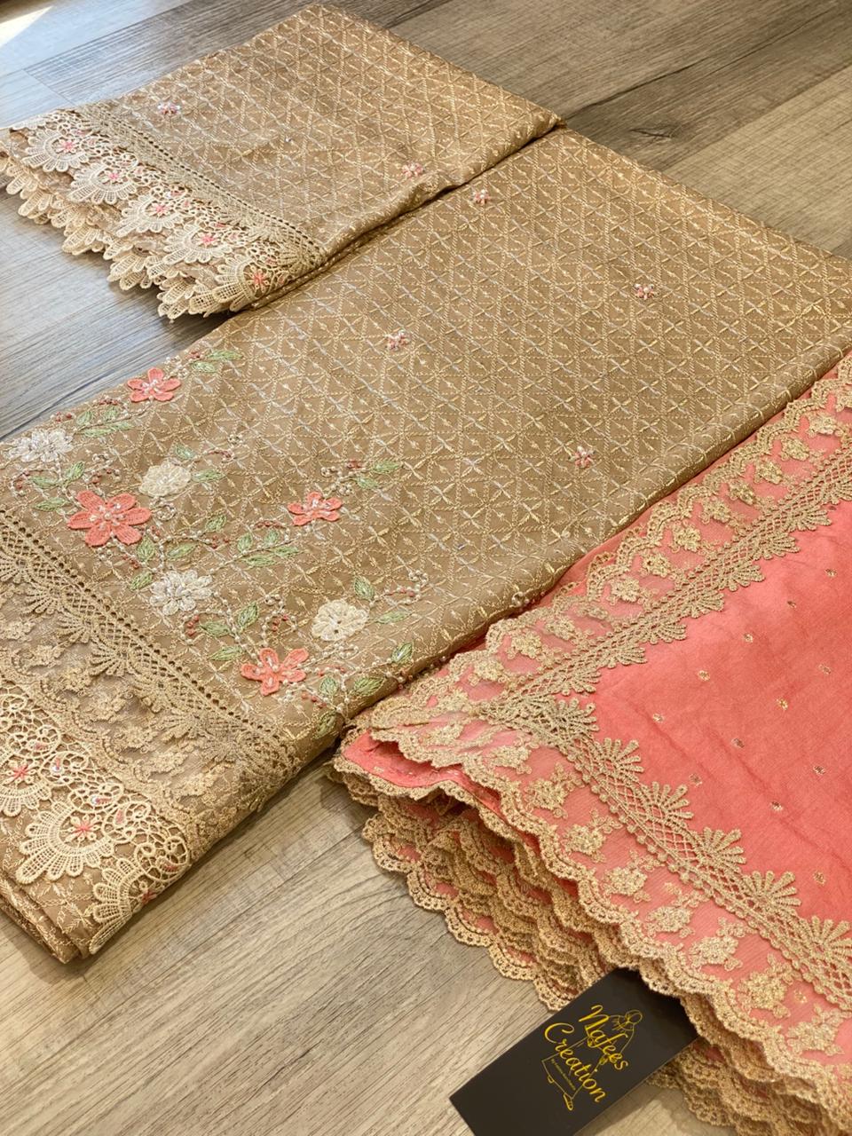 Chicken fabric with handwork embroidery contrasting pink dupatta