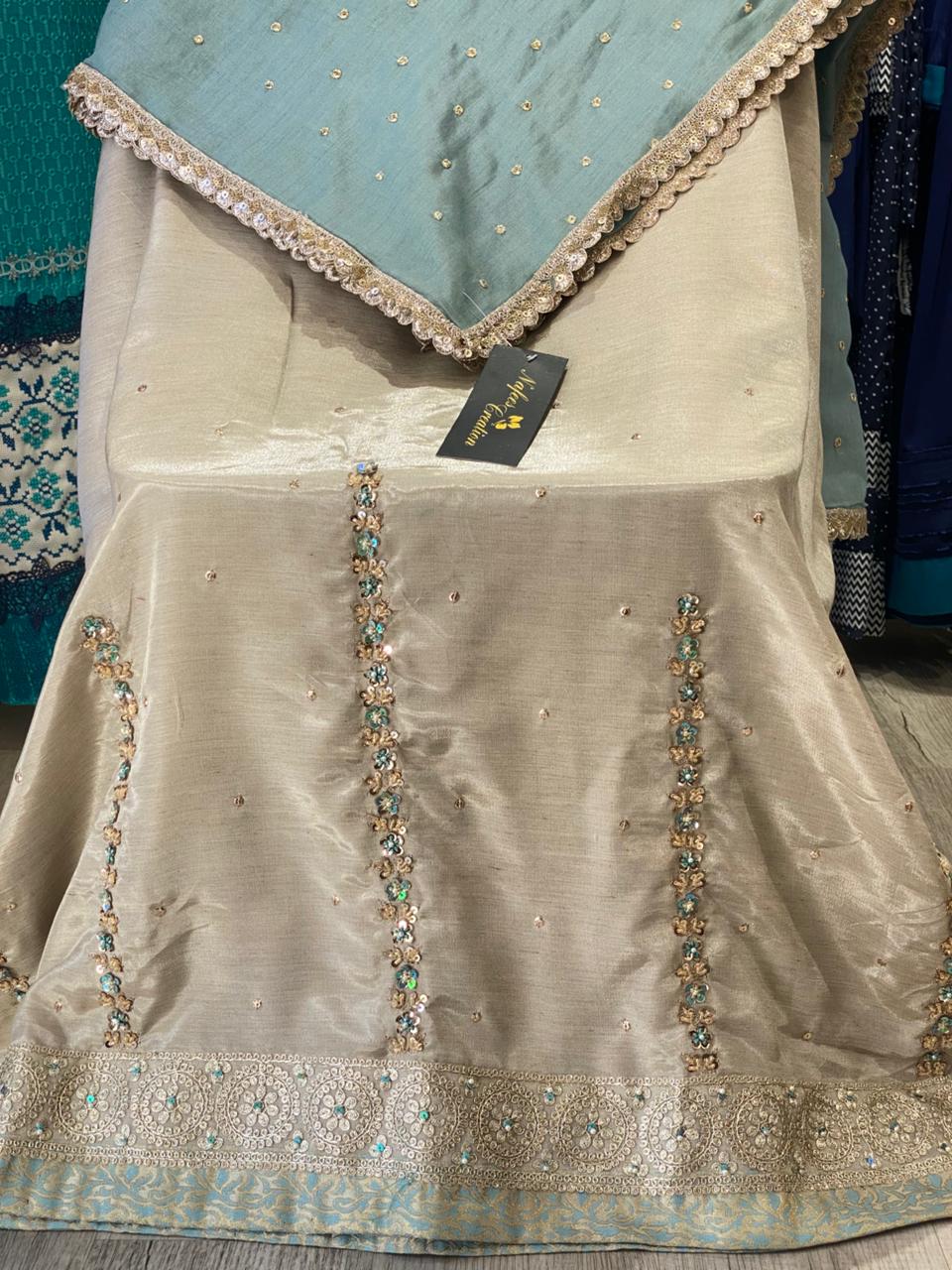 Self shine fabric with handwork embroidery contrasting cadet blue dupatta
