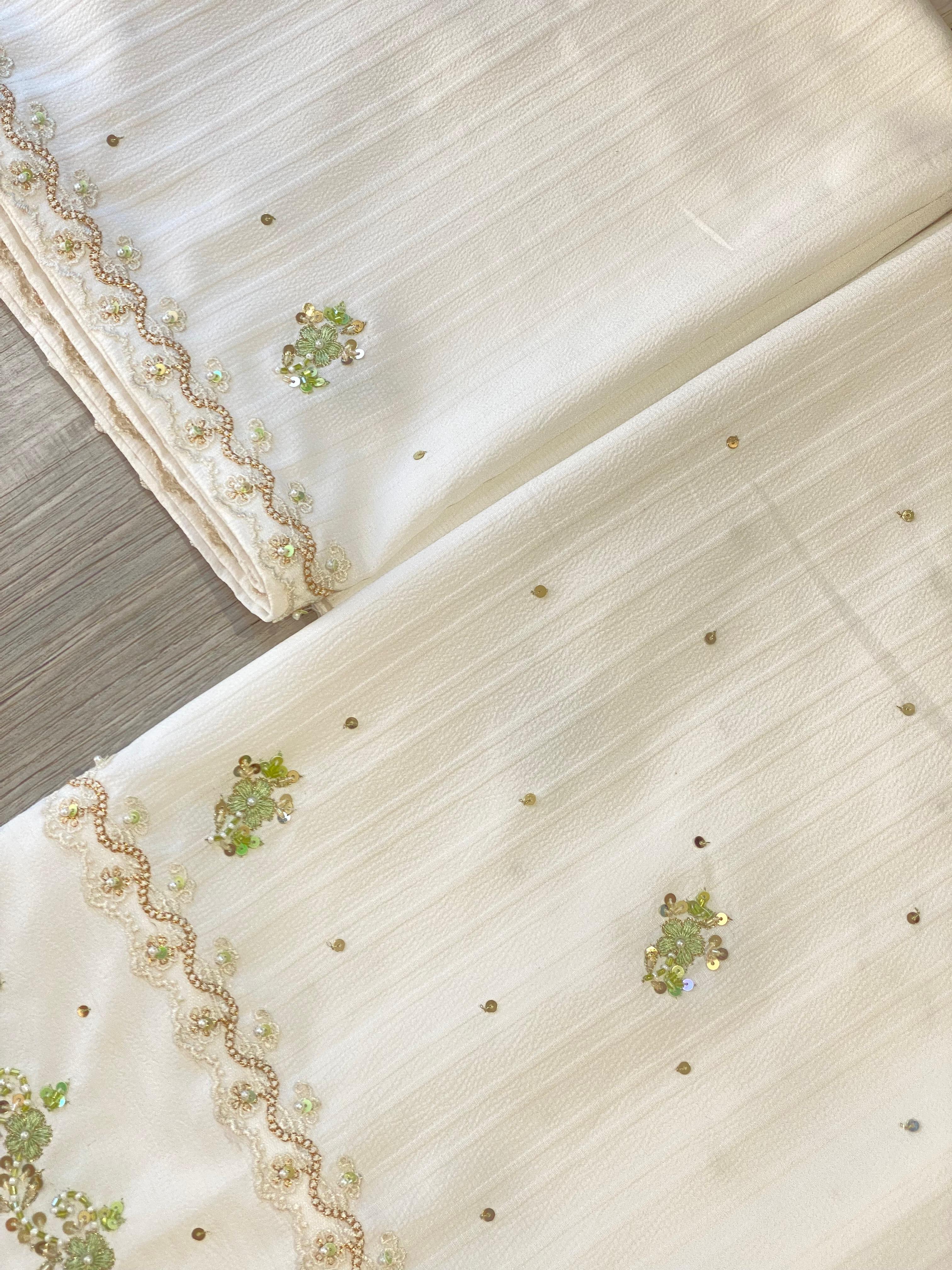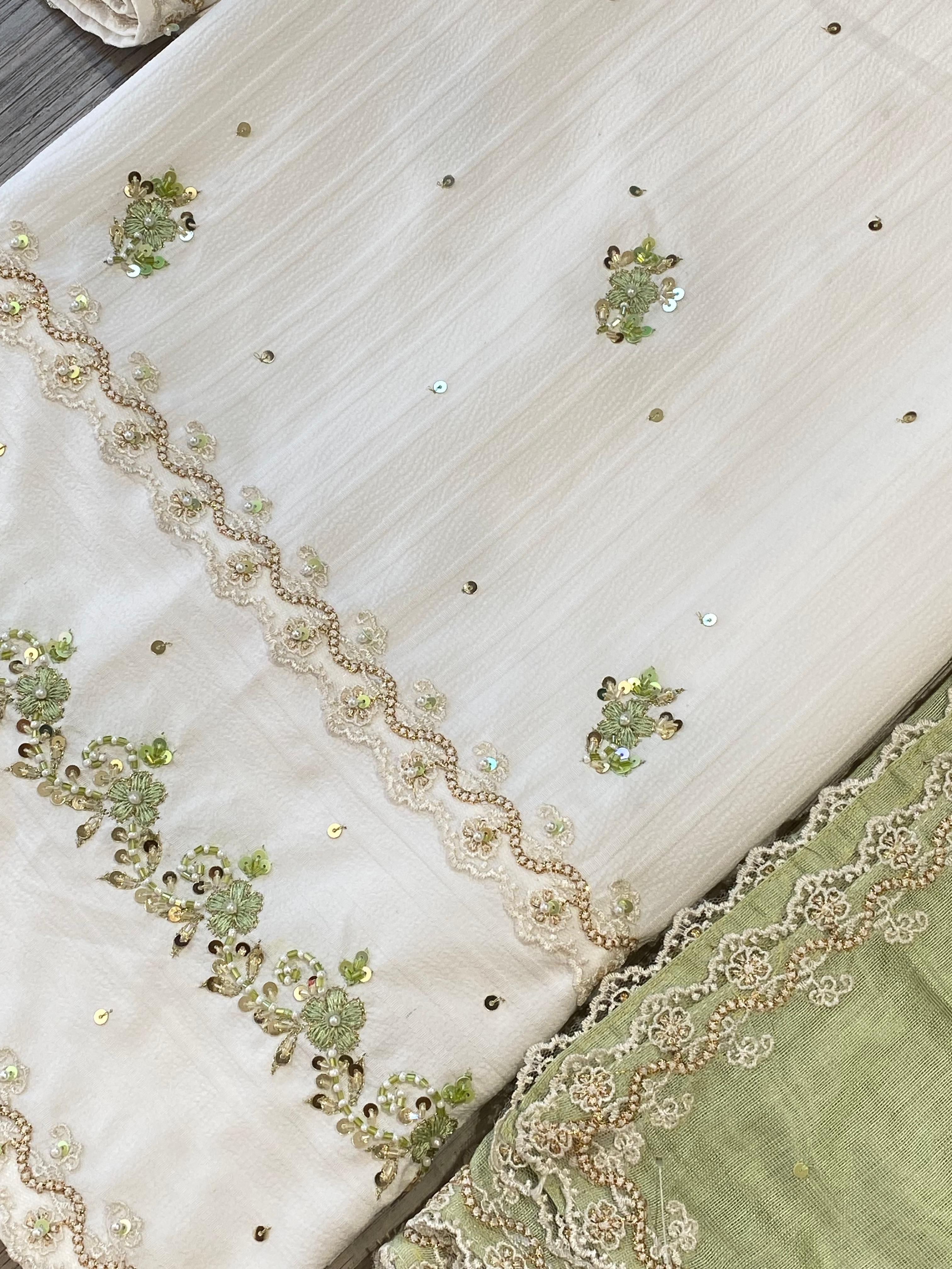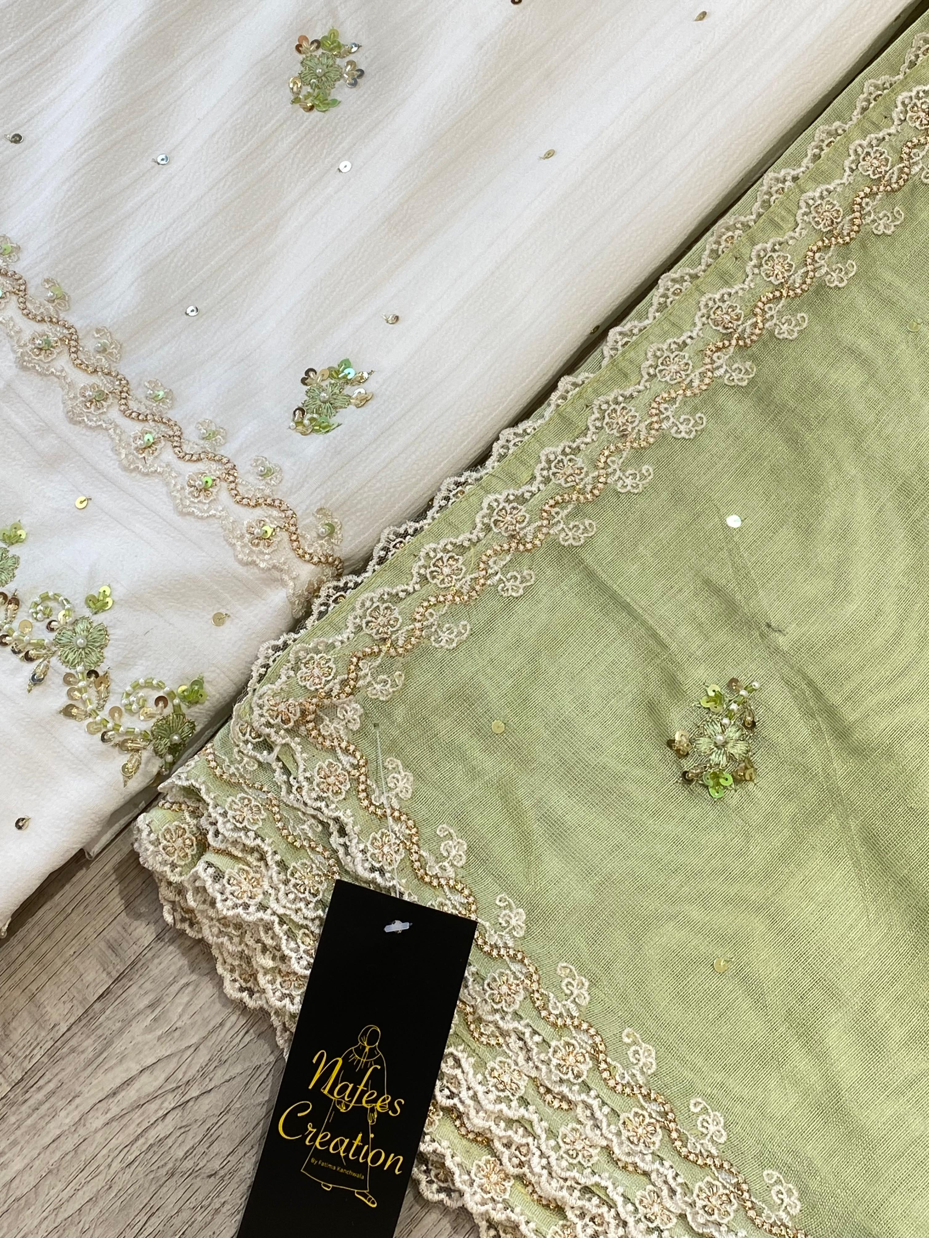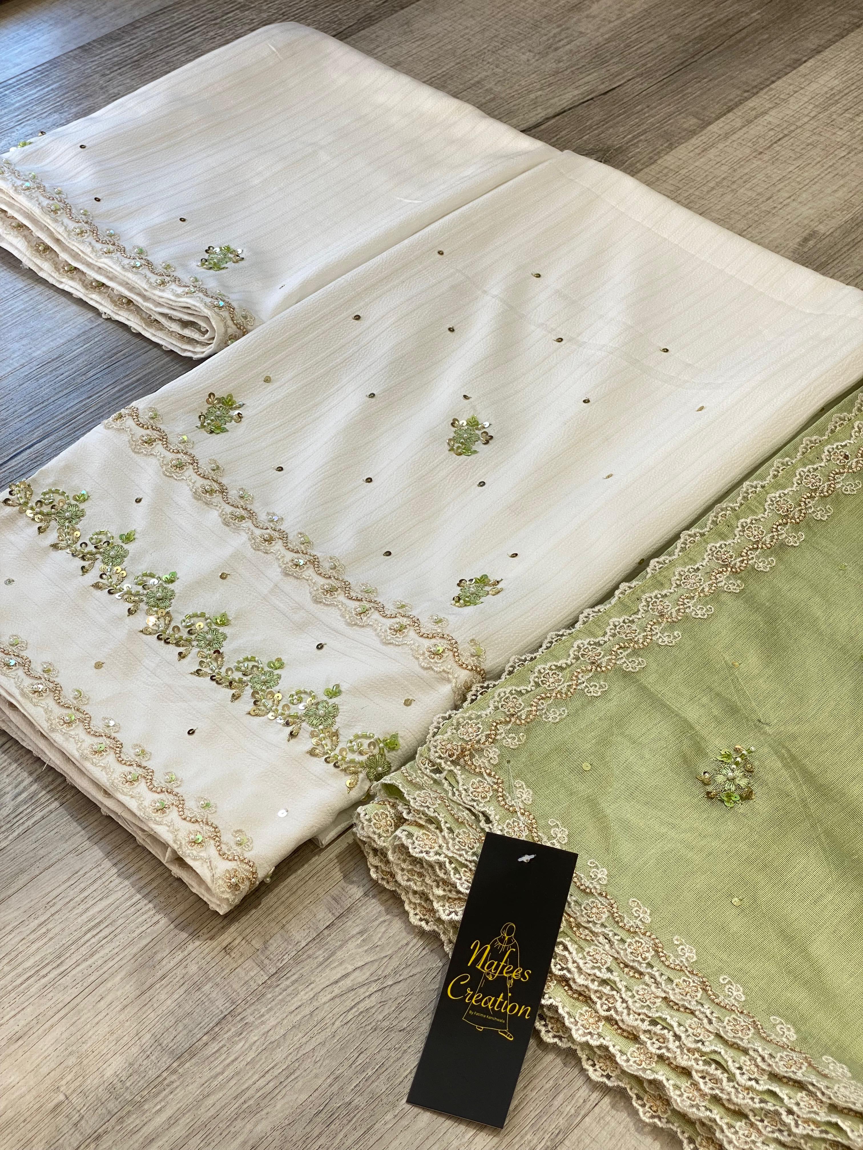 Premium quality stripped abaya fabric with handwork embroidery contrasting pistachio dupatta