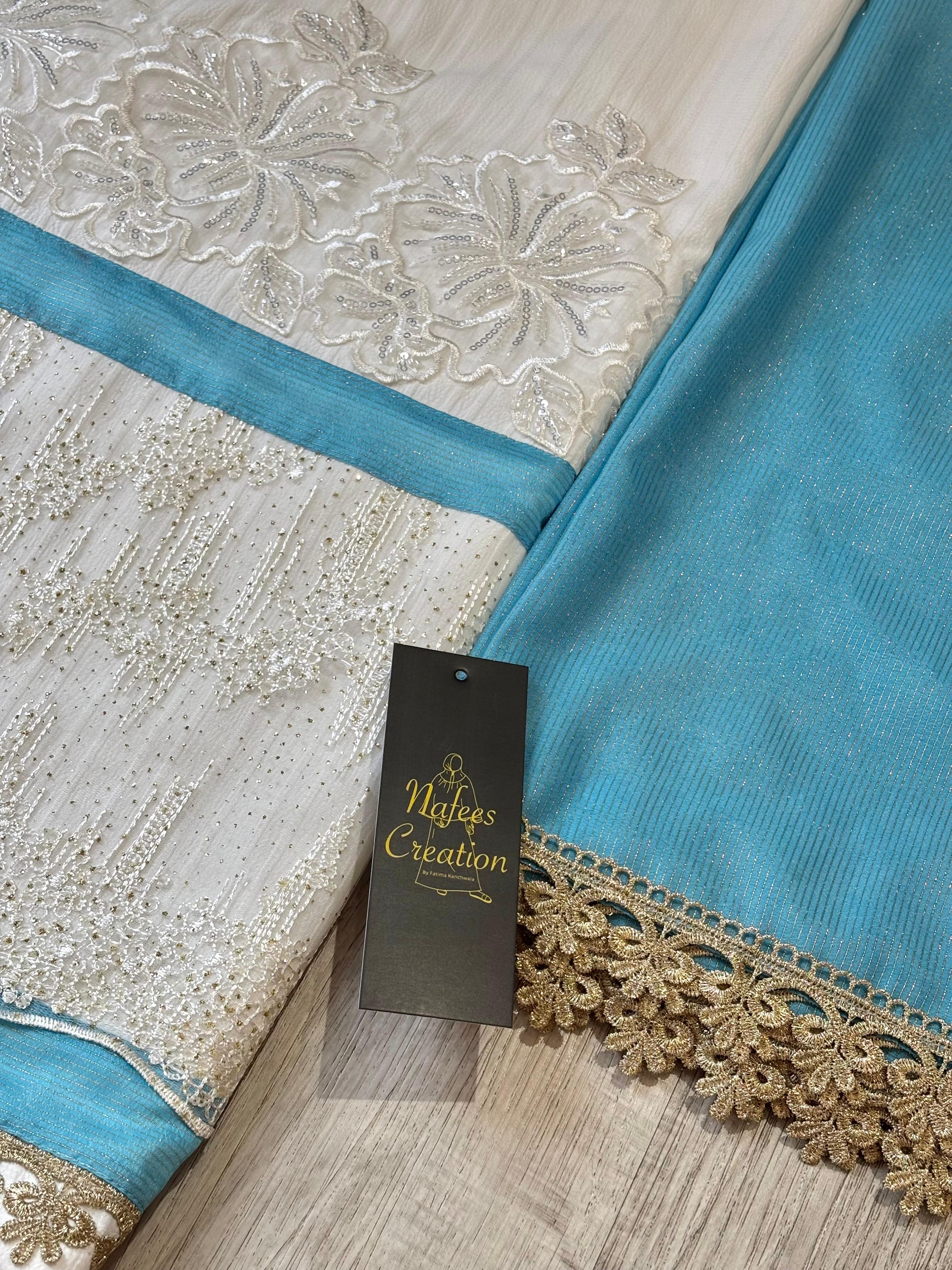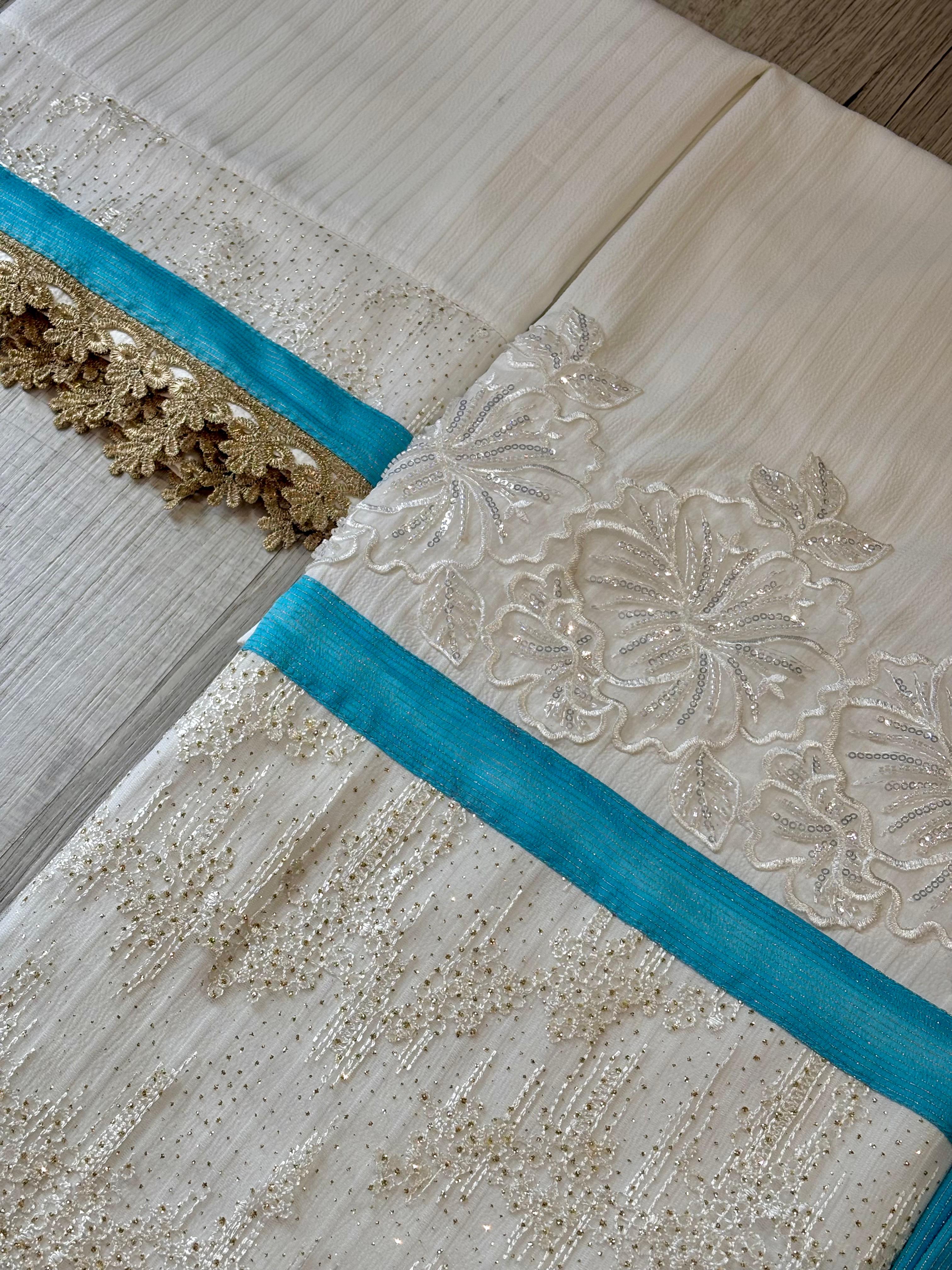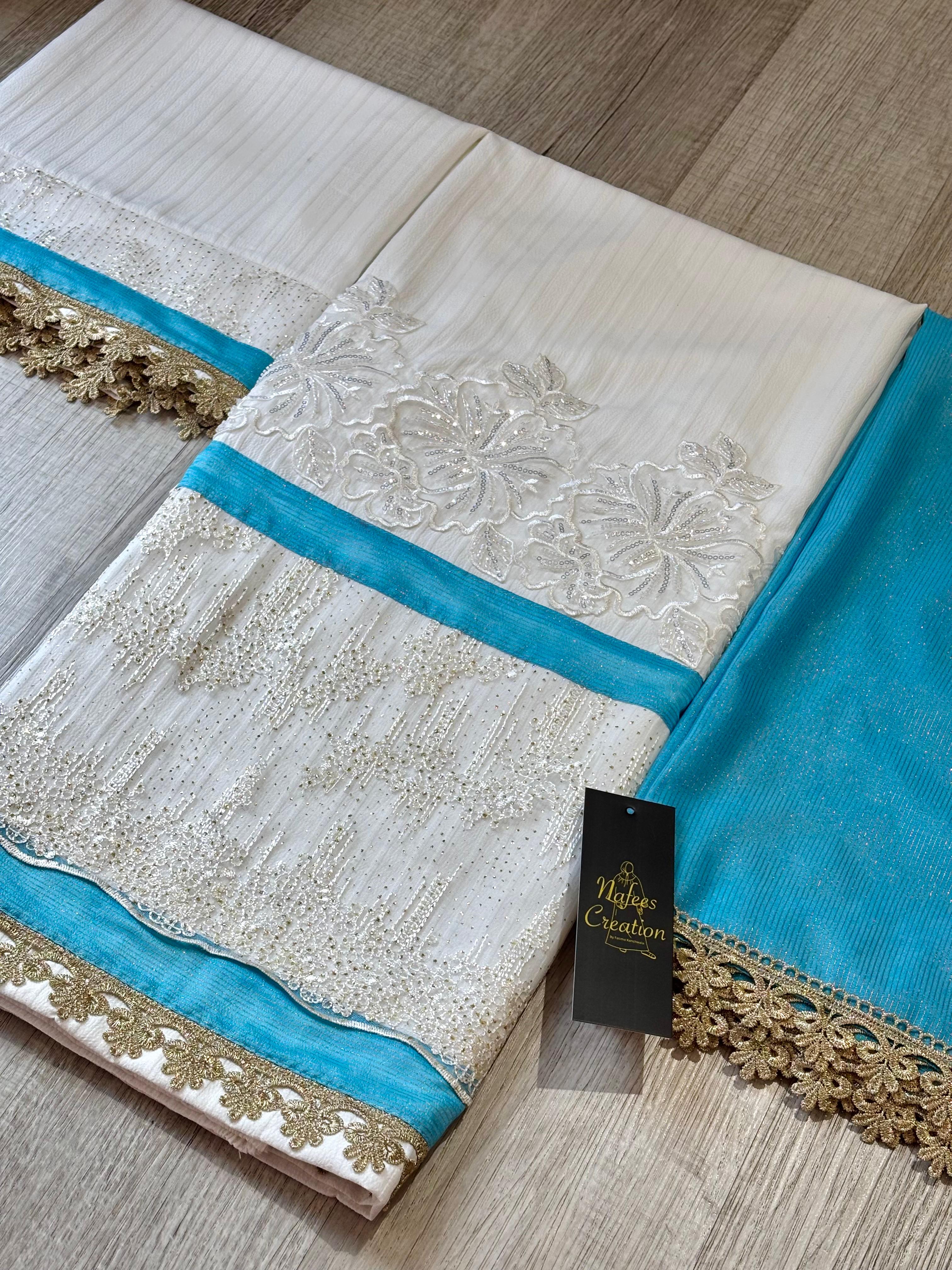 Premium quality stripped abaya fabric with fancy lacing contrasting ferozi dupatta